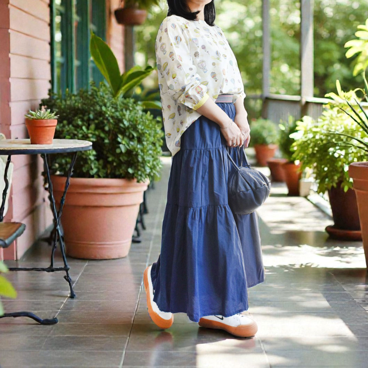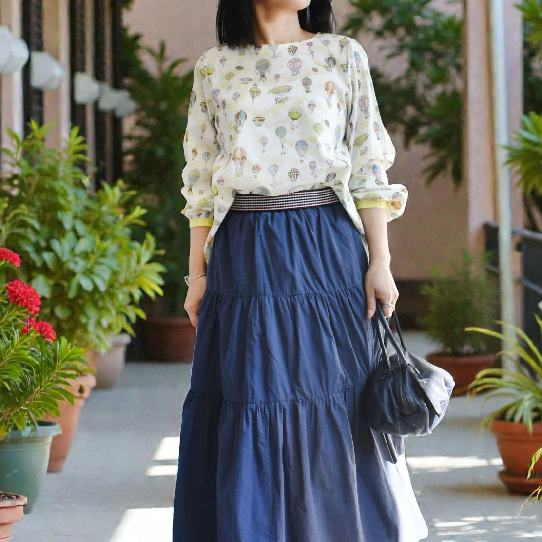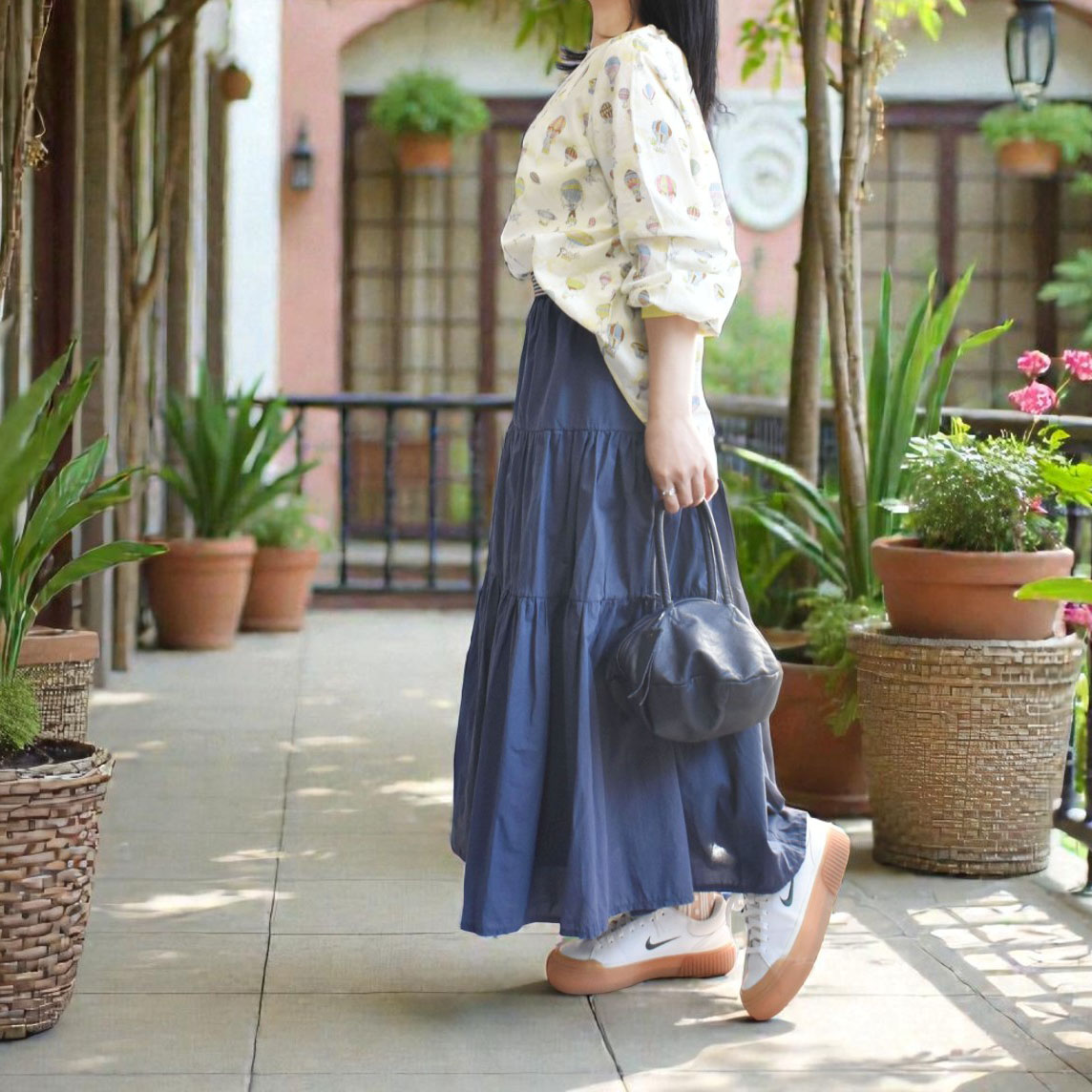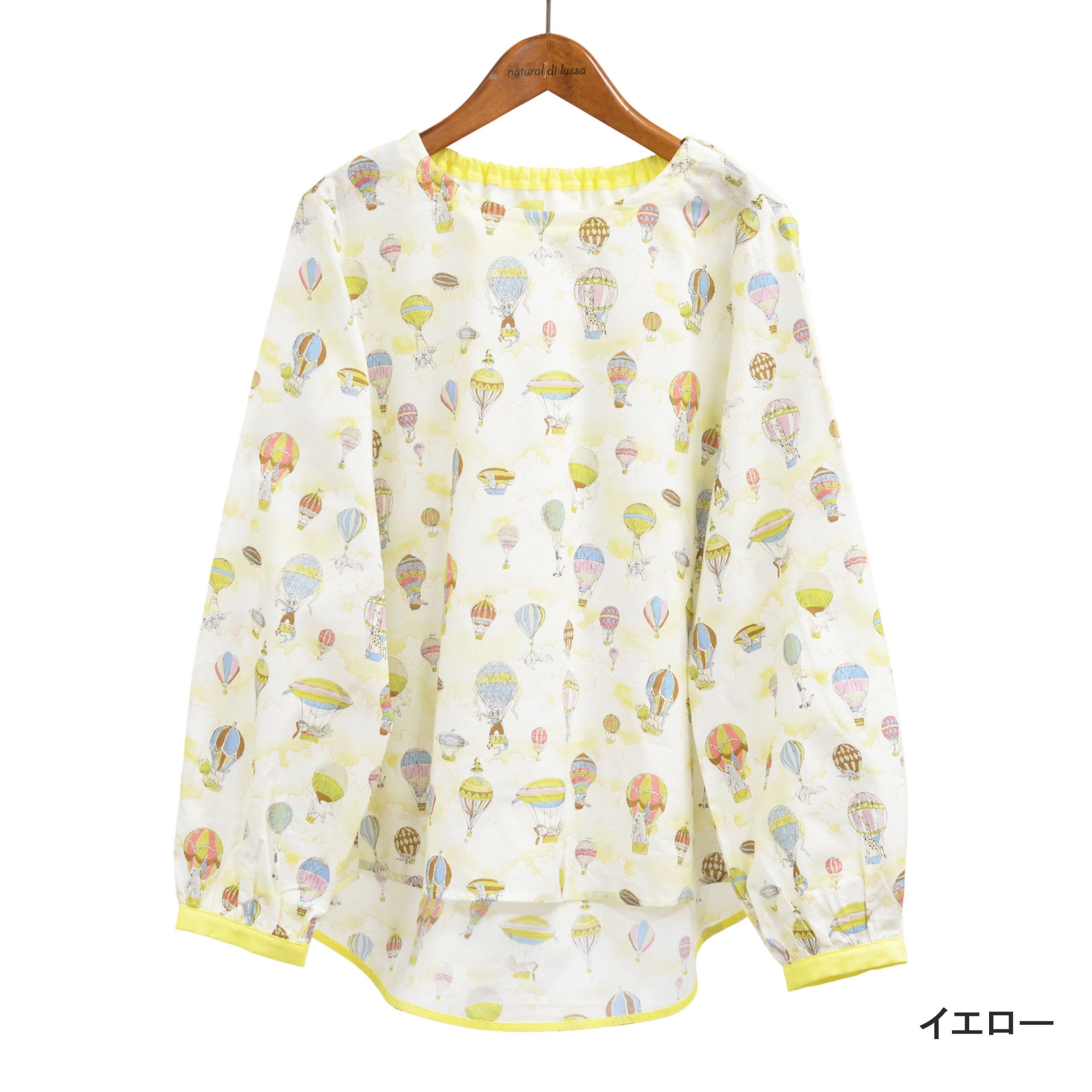 気球モチーフの淡く可愛らしいプリントが、装いにやわらかな華やかさをプラス。