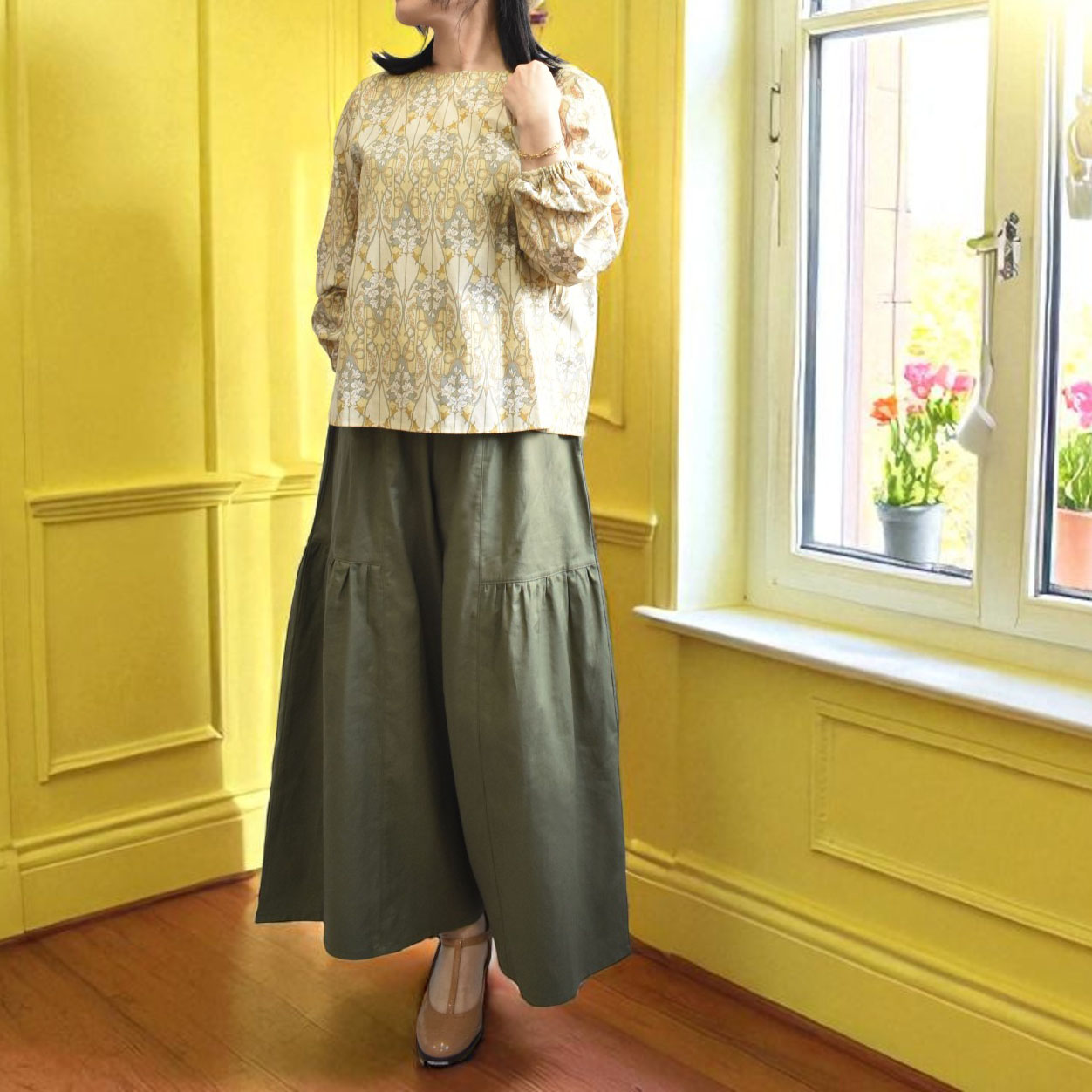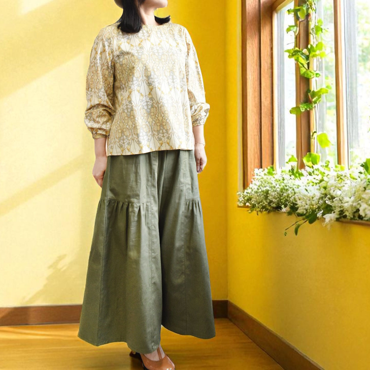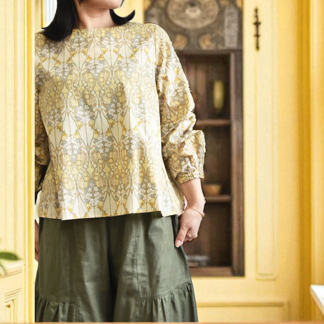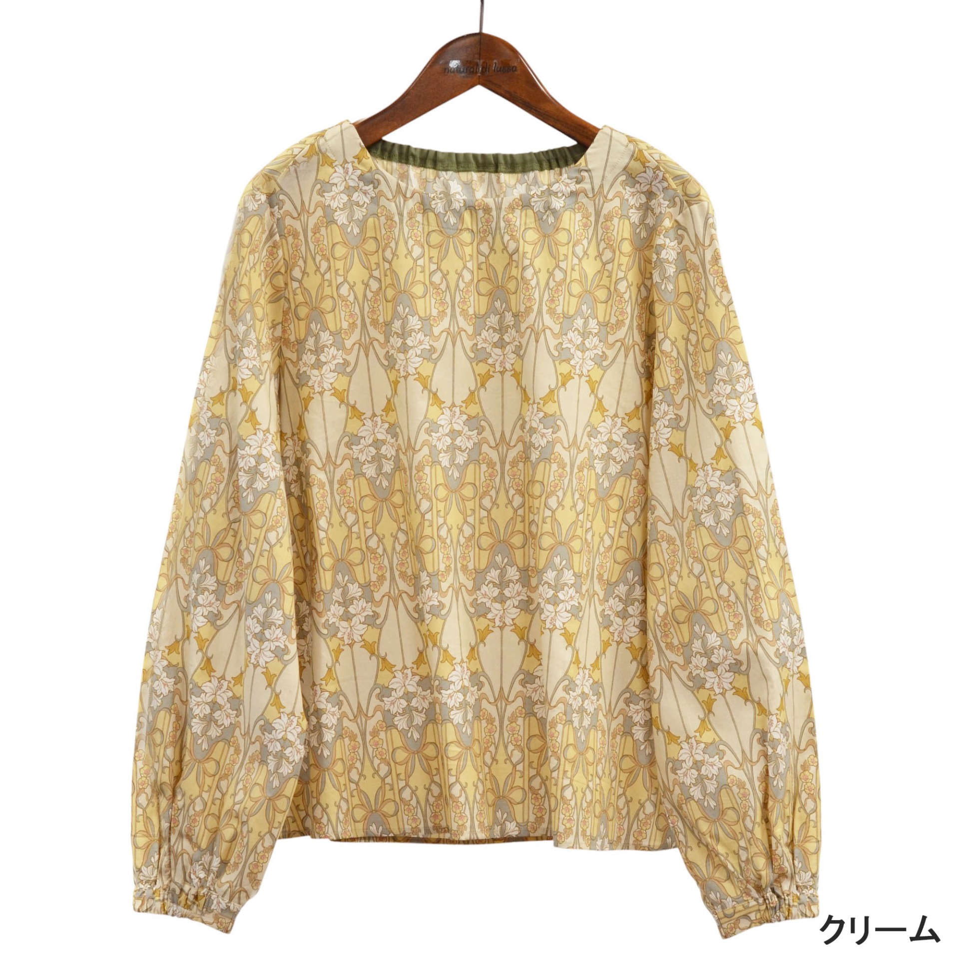 アールヌーボーを思わせるクラシカルな花模様が印象的なブラウス。 落ち着いた色合いのクリームベースに、繊細なモチーフが映えるデザインは、大人のナチュラルスタイルにぴったりです。