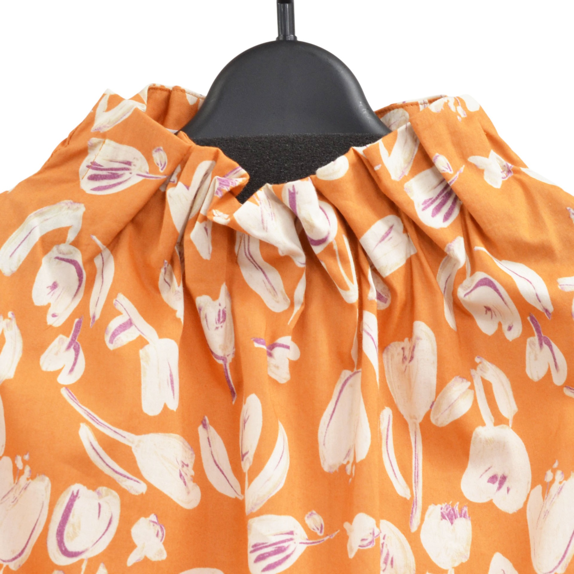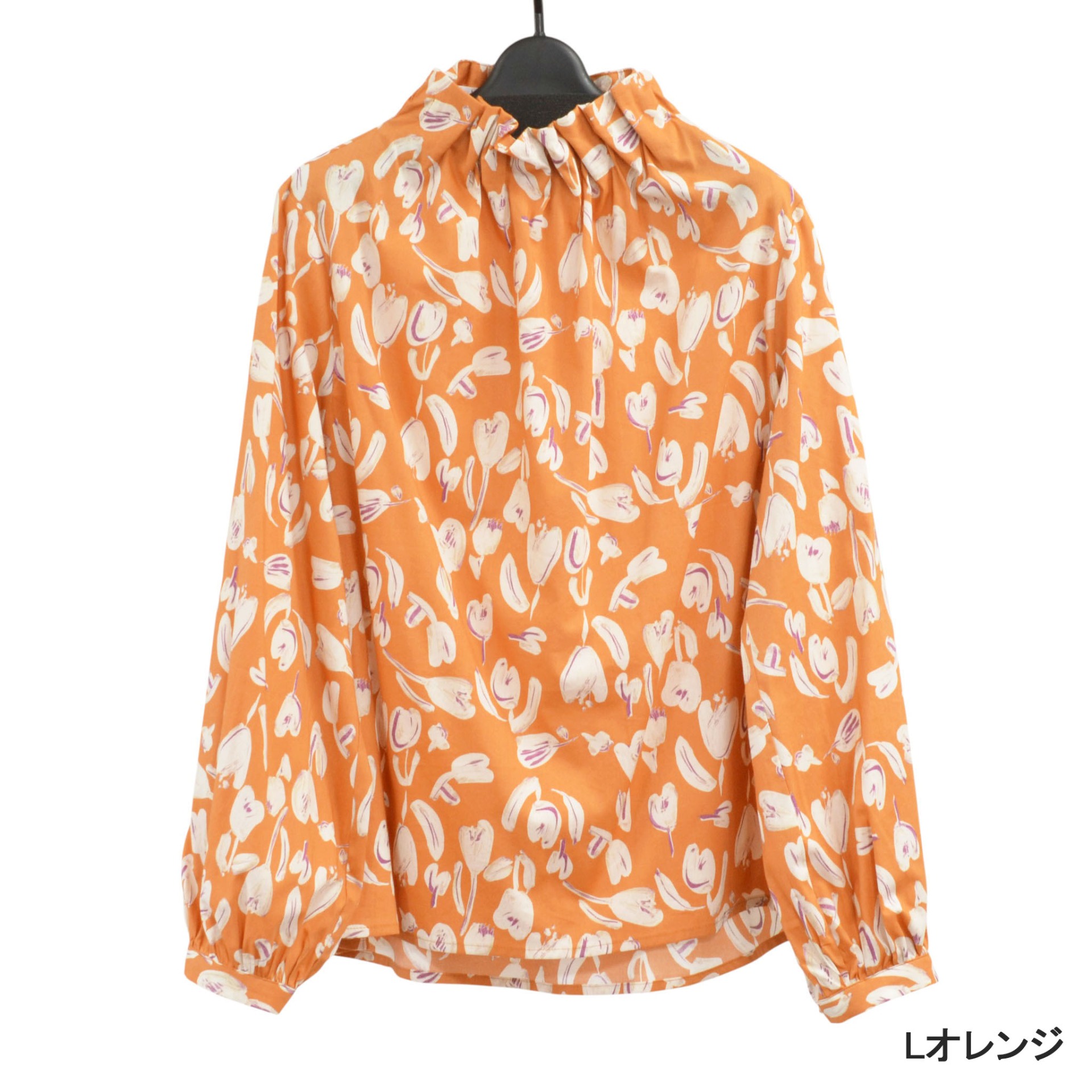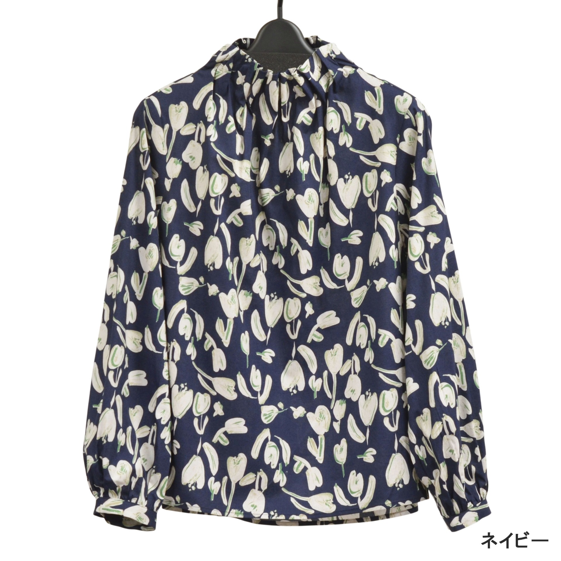 首元はギャザーを寄せたハイネックデザインで、上品で女性らしい印象に。