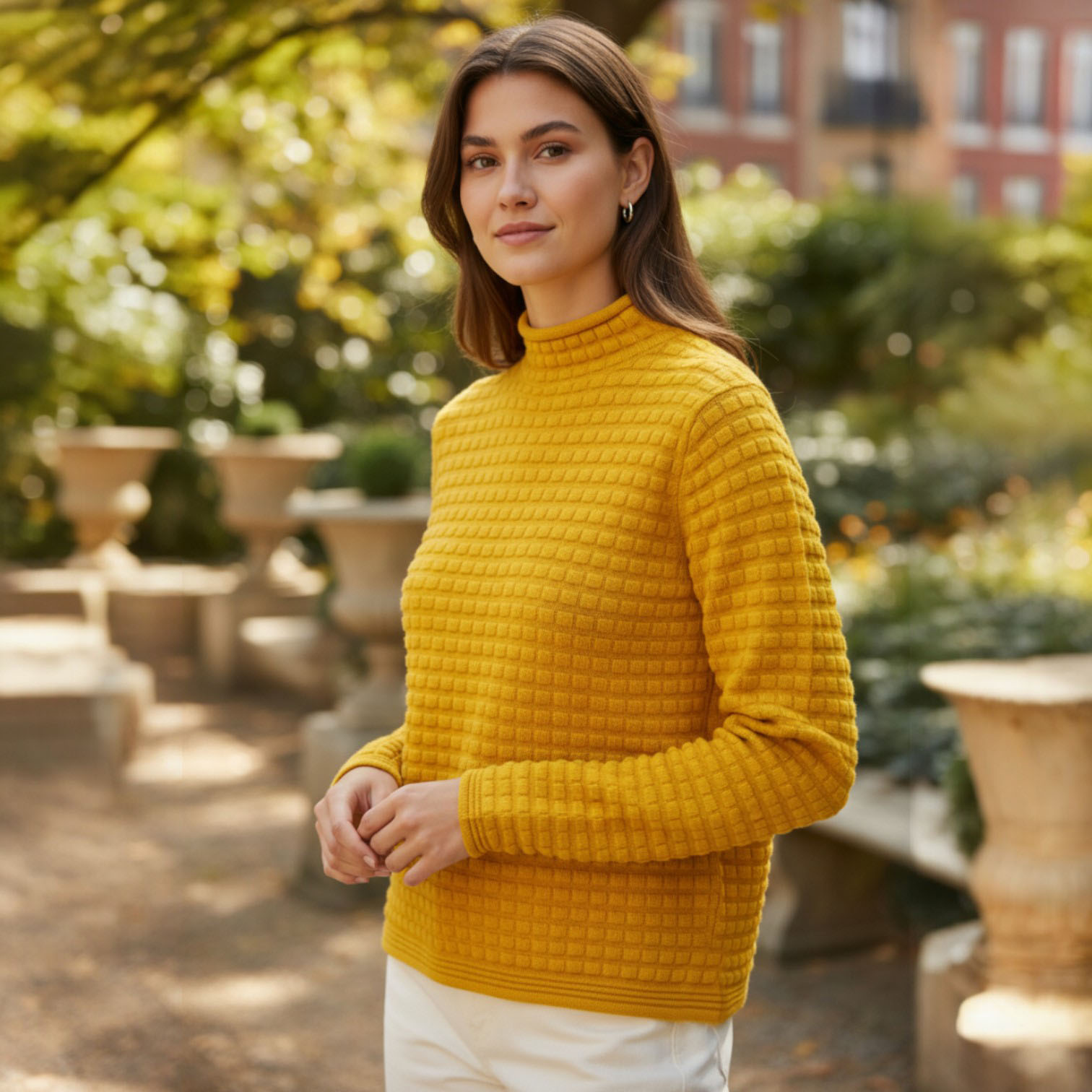 柔らかな立体感が装いに上質なニュアンスを添えるボトルネックニット。
