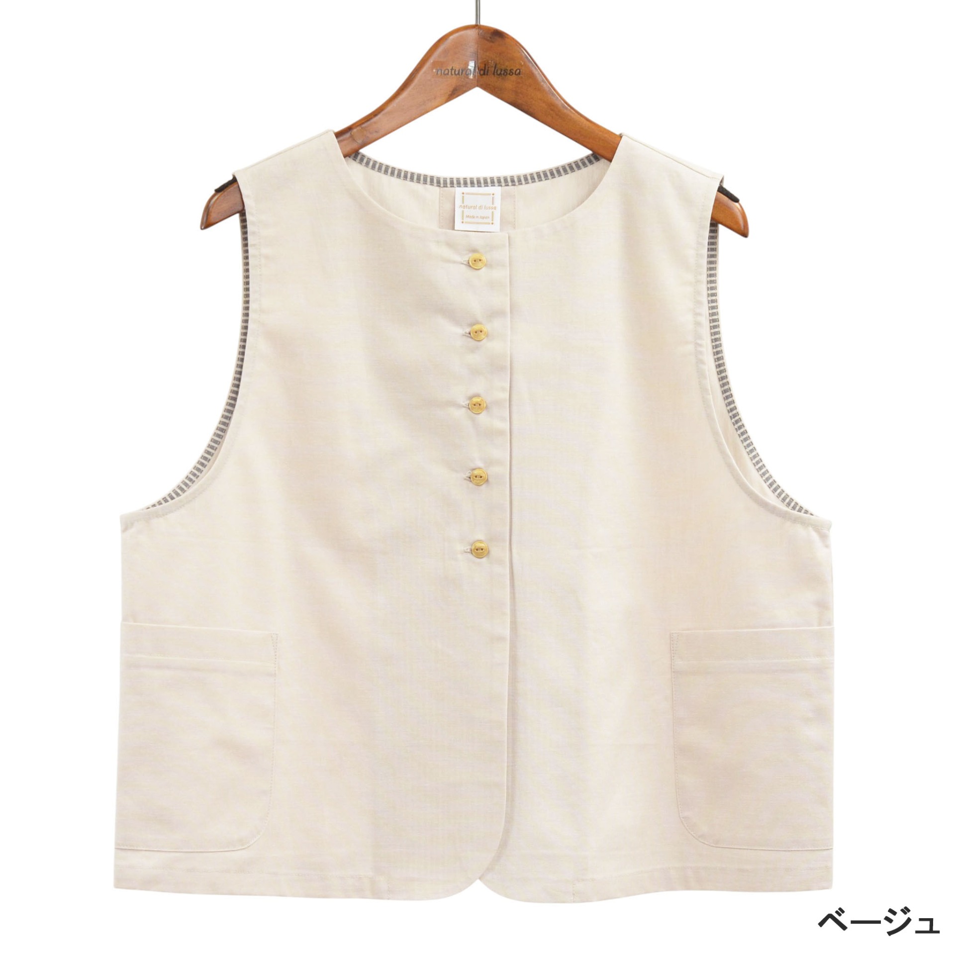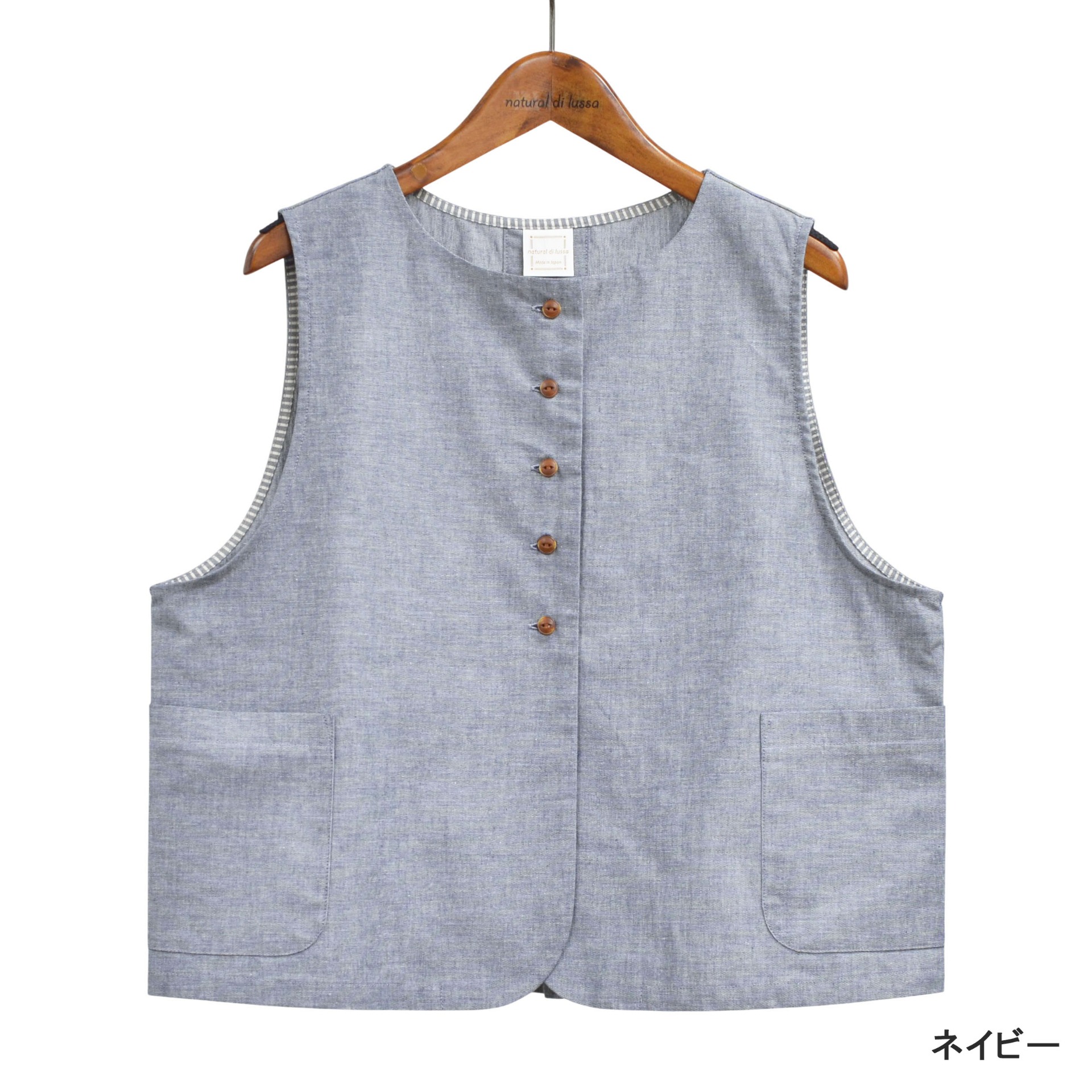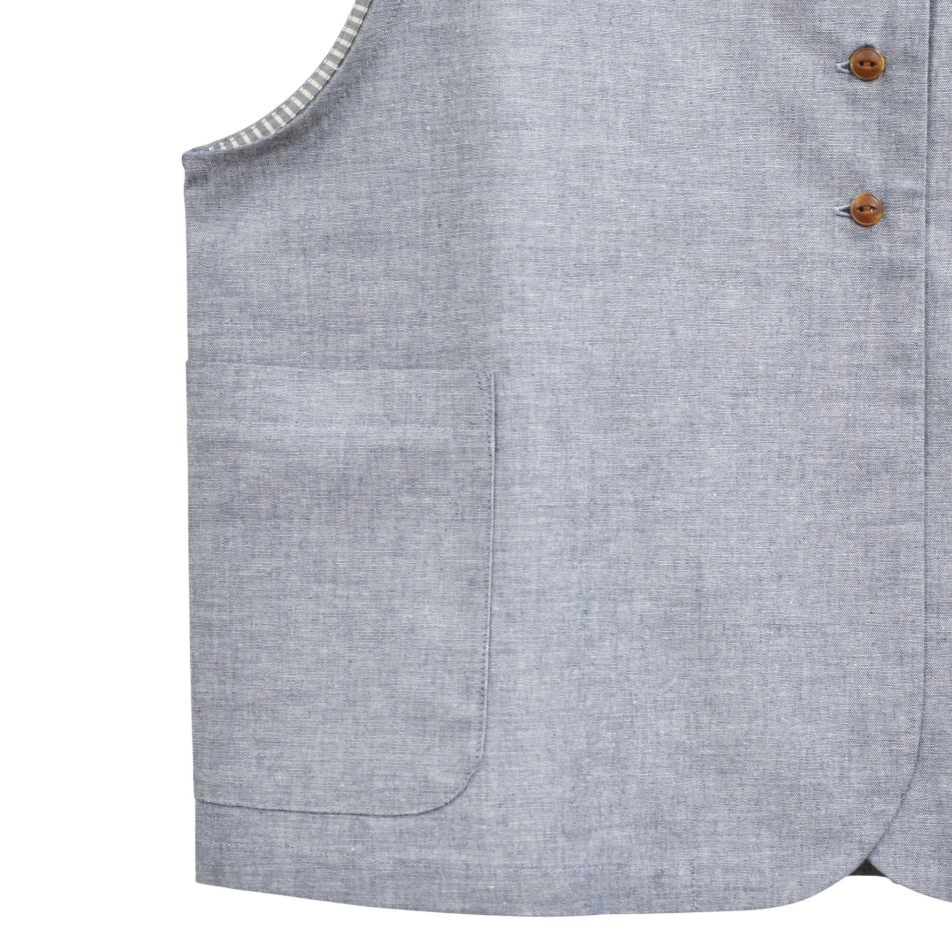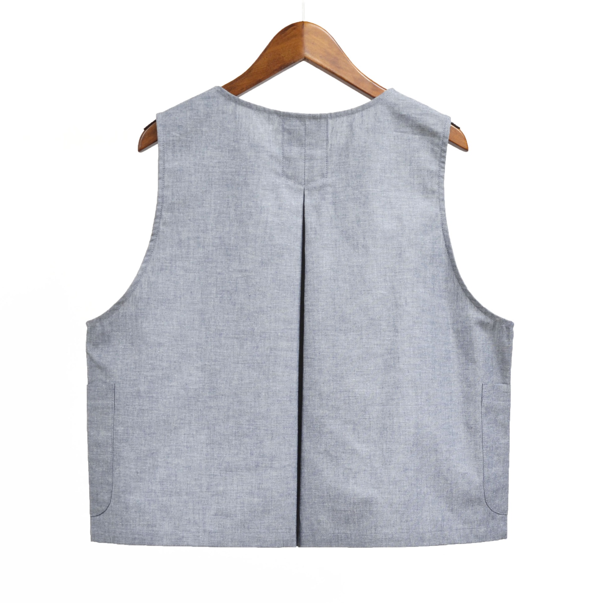 軽やかなダンガリー素材で仕立てた、ナチュラルな雰囲気の前開きベスト。