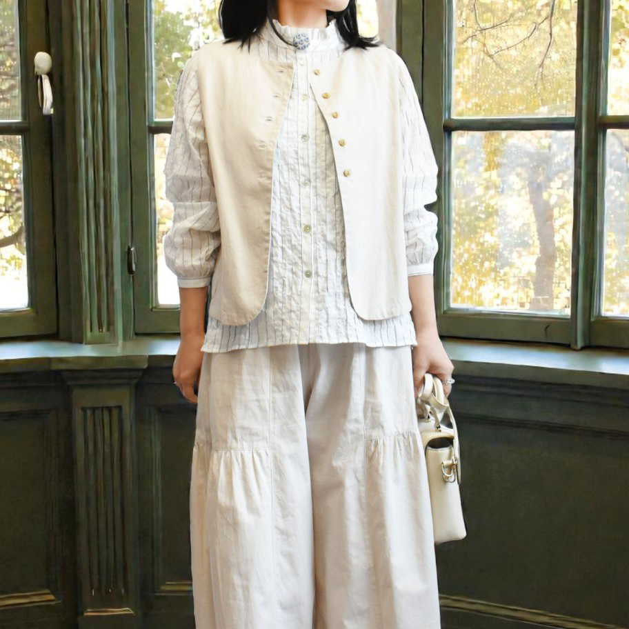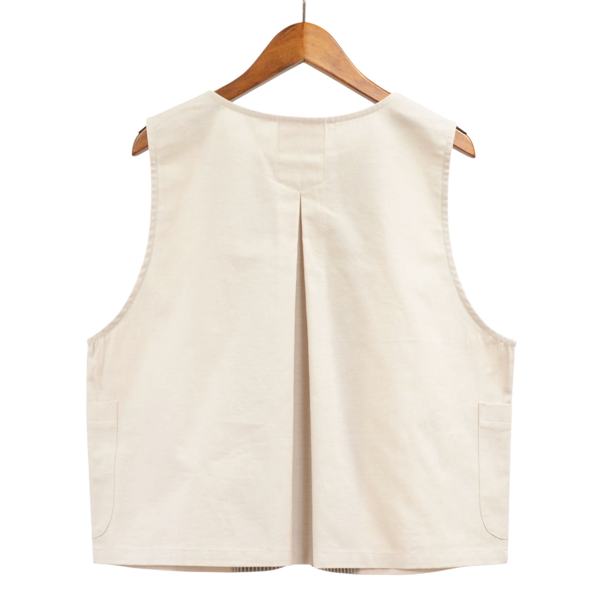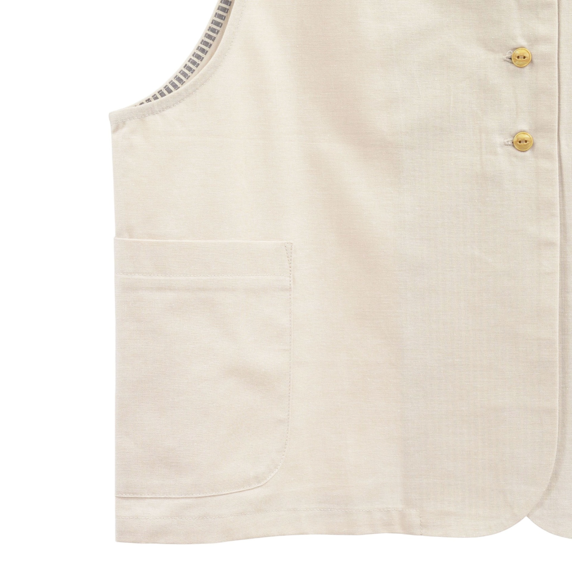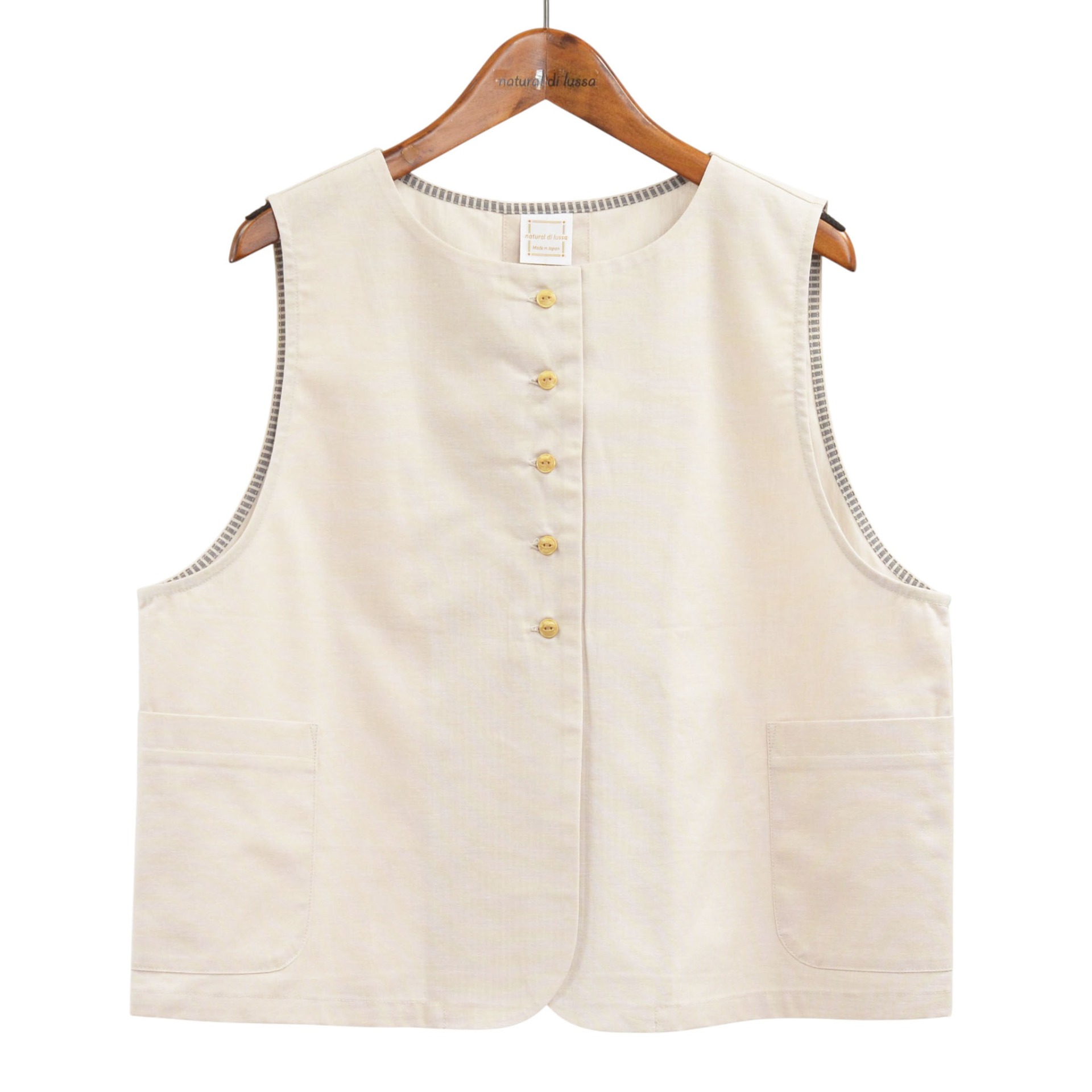 軽やかなダンガリー素材で仕立てた、ナチュラルな雰囲気の前開きベスト。