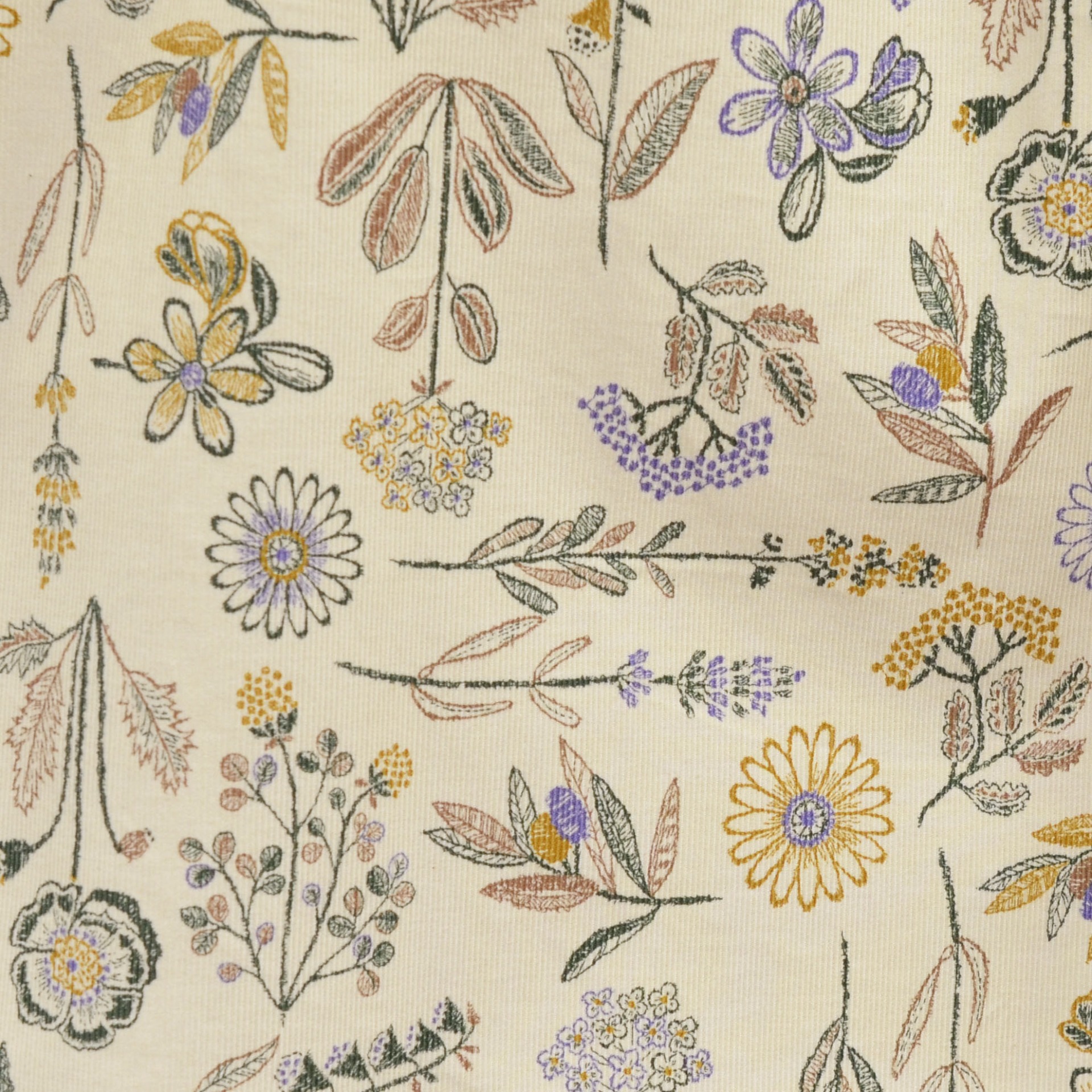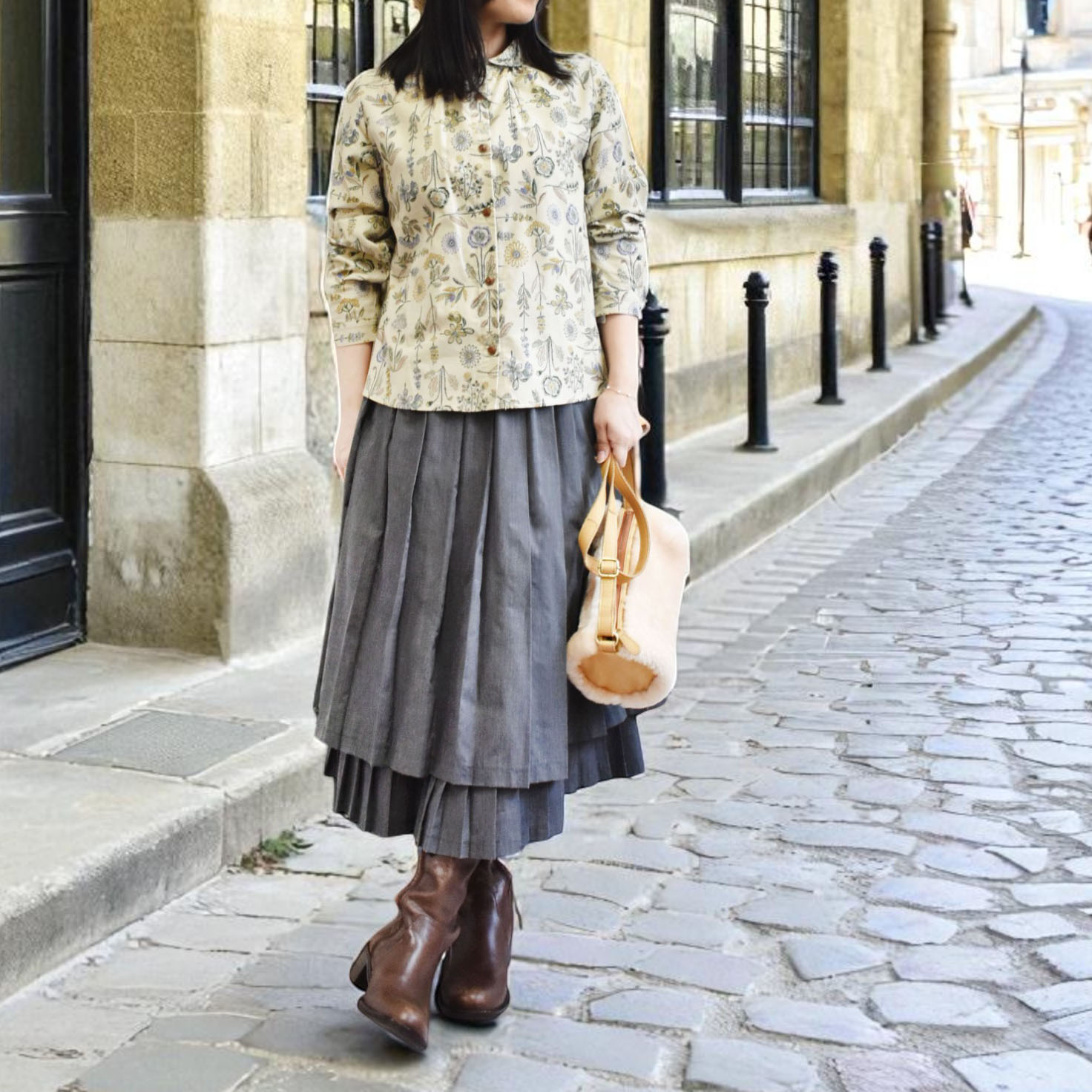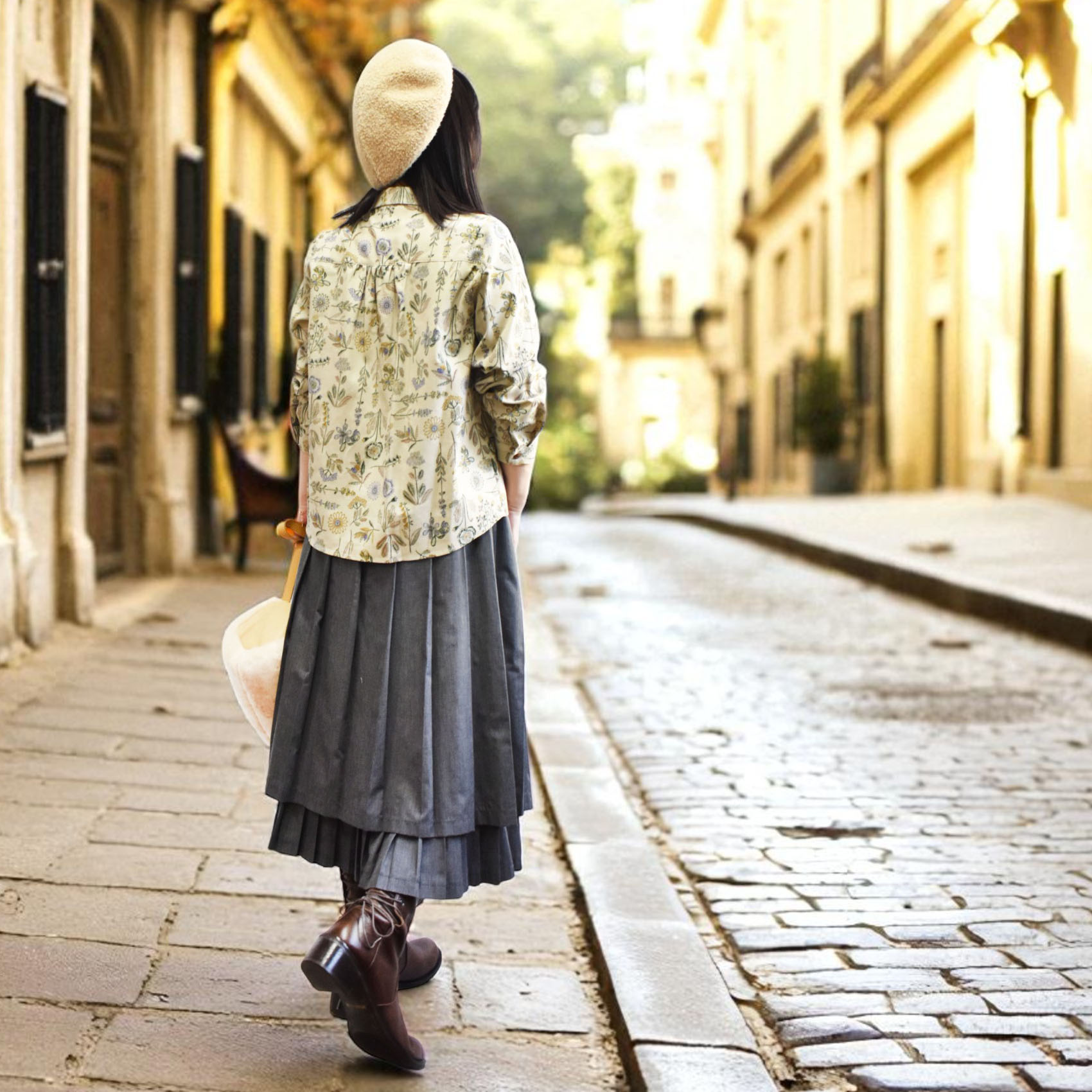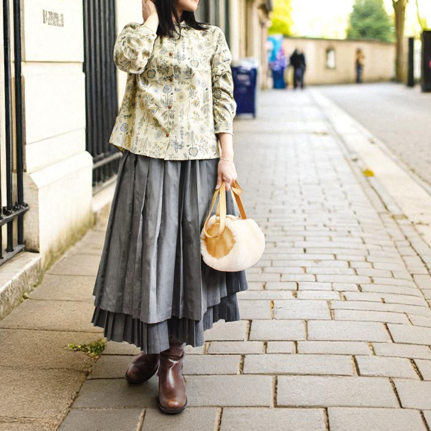 繊細な草花を散りばめた生地は、派手すぎず落ち着いた色使いで、普段のコーデに自然と馴染みます。