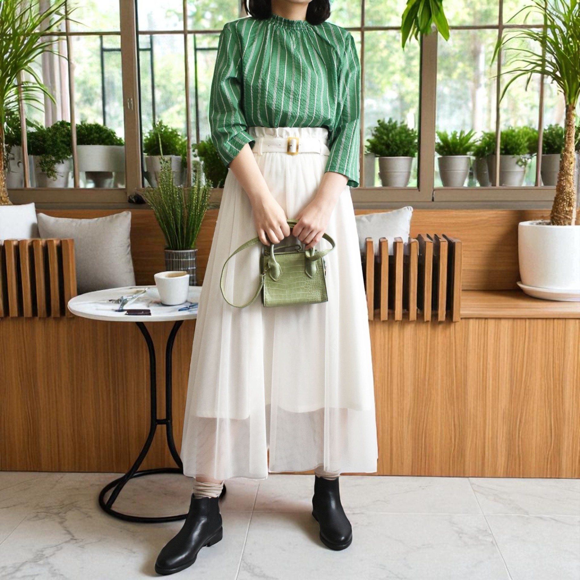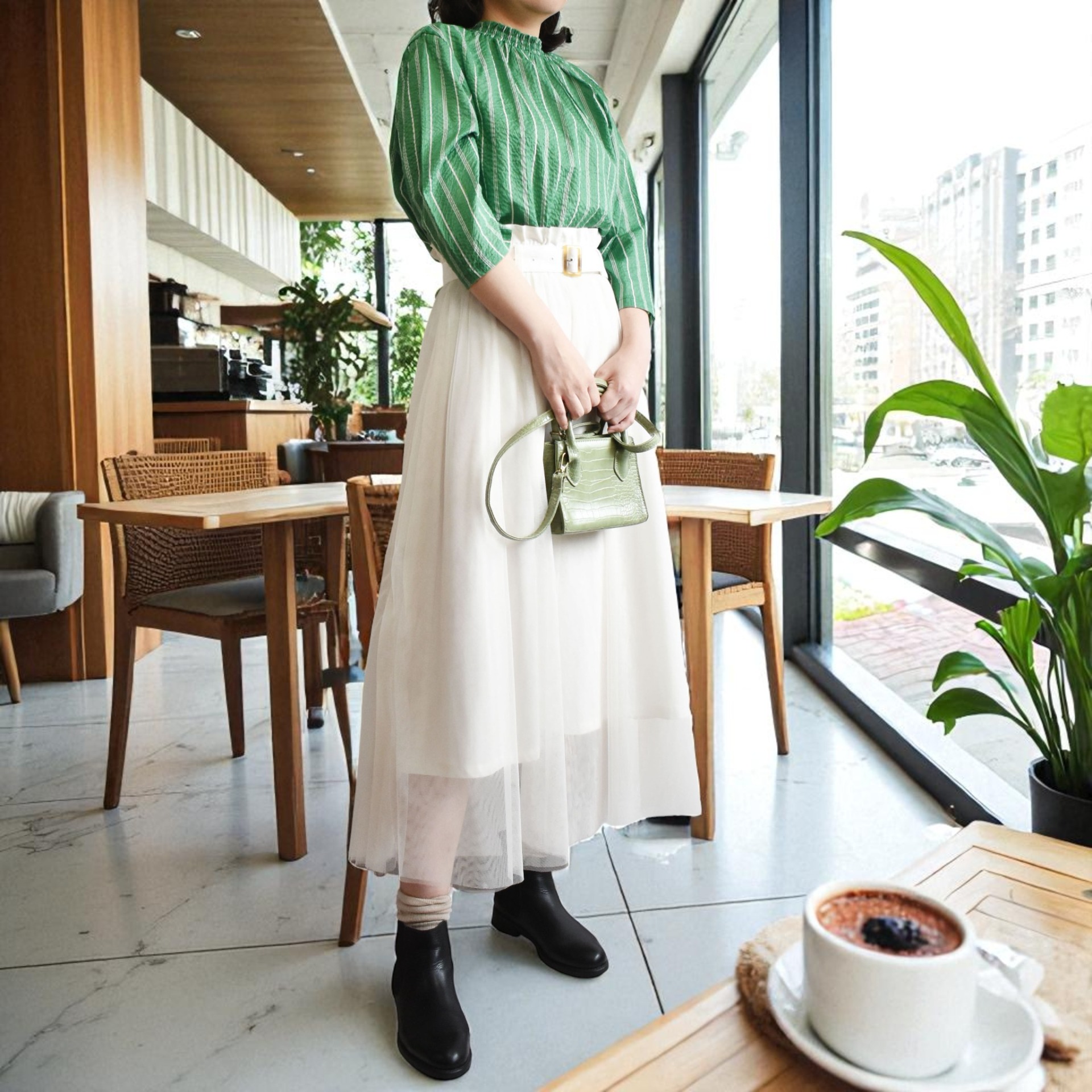 首元はギャザー仕様で柔らかな表情をプラス。ゆったりとしたシルエットで体型カバーもしながら、抜け感のあるスタイルを演出します。