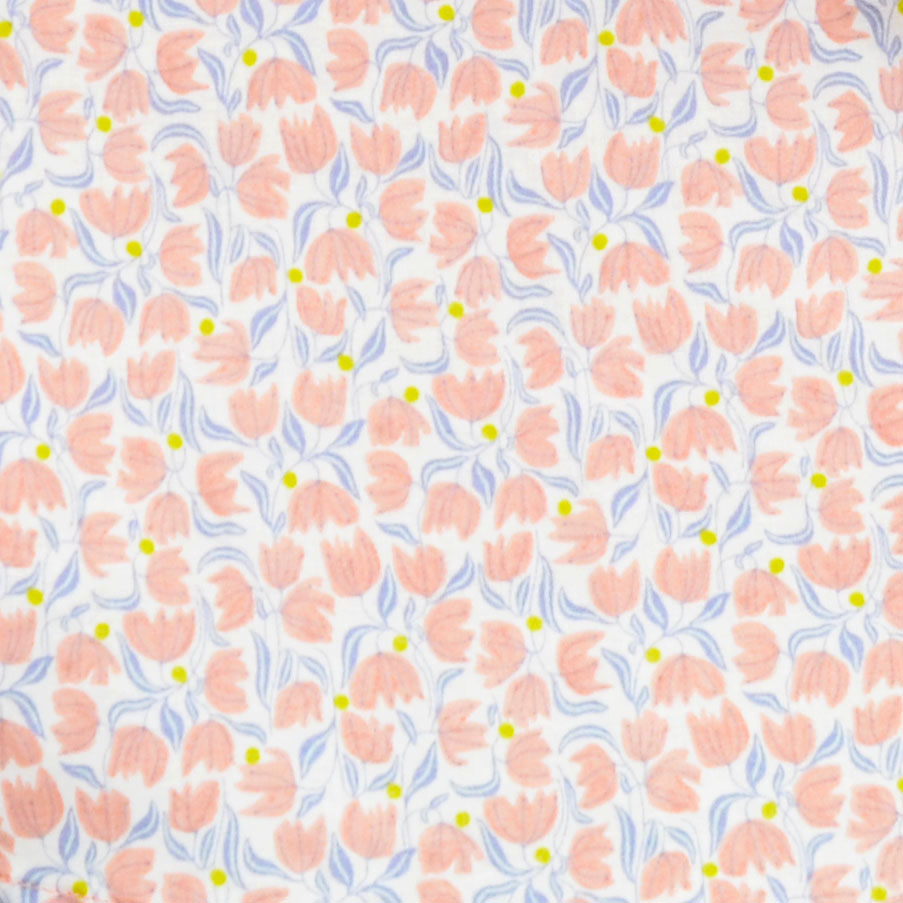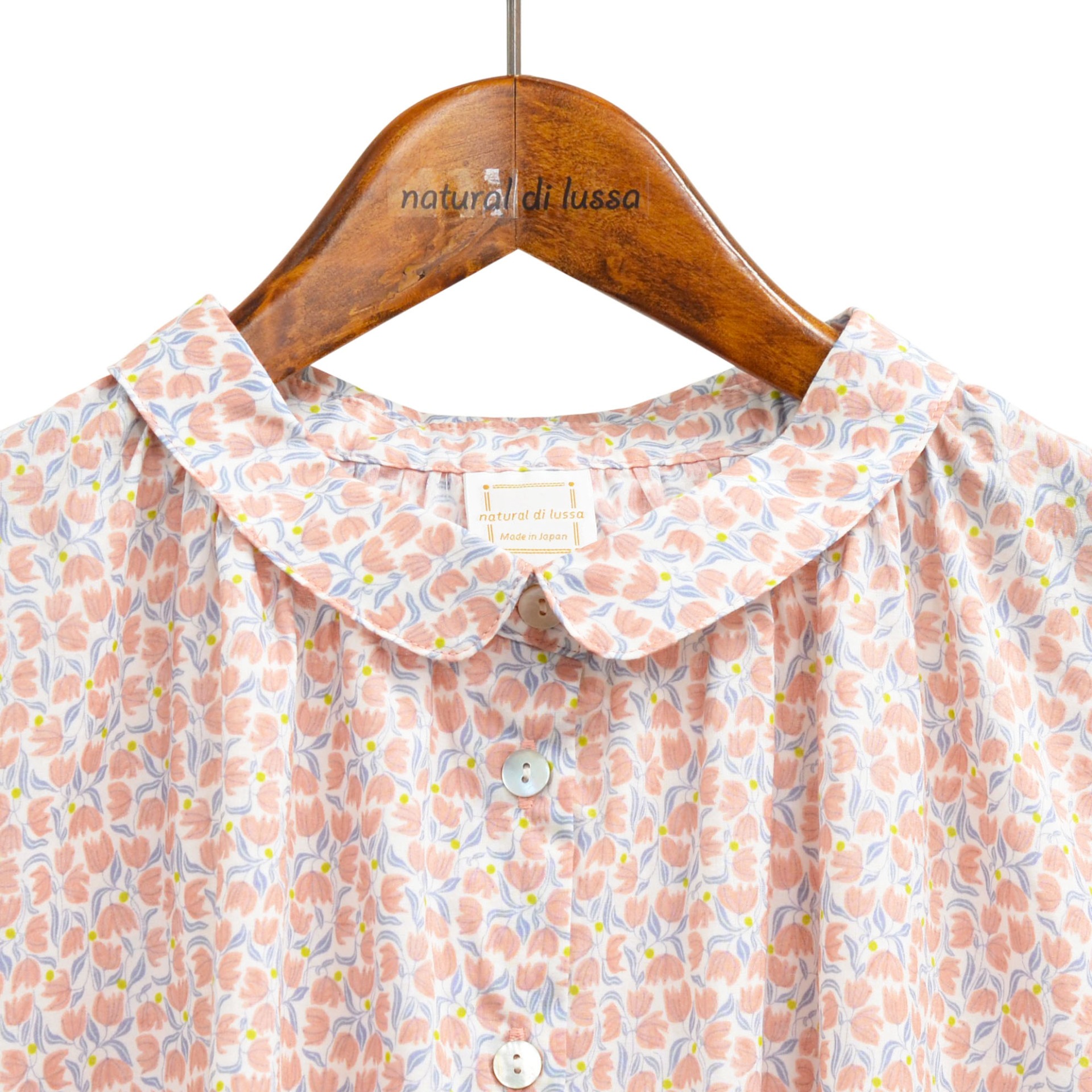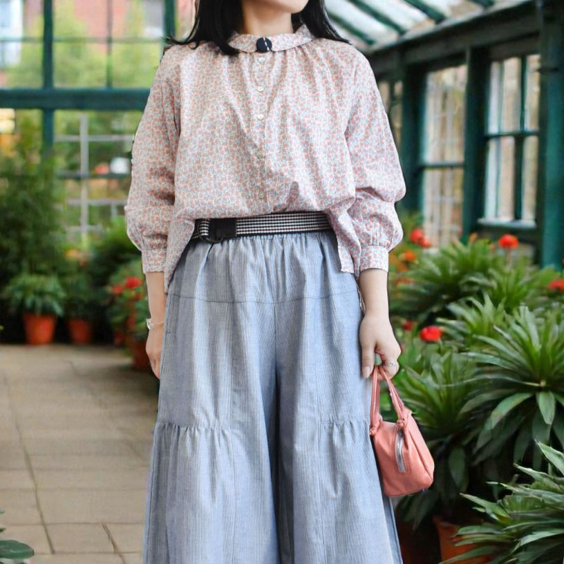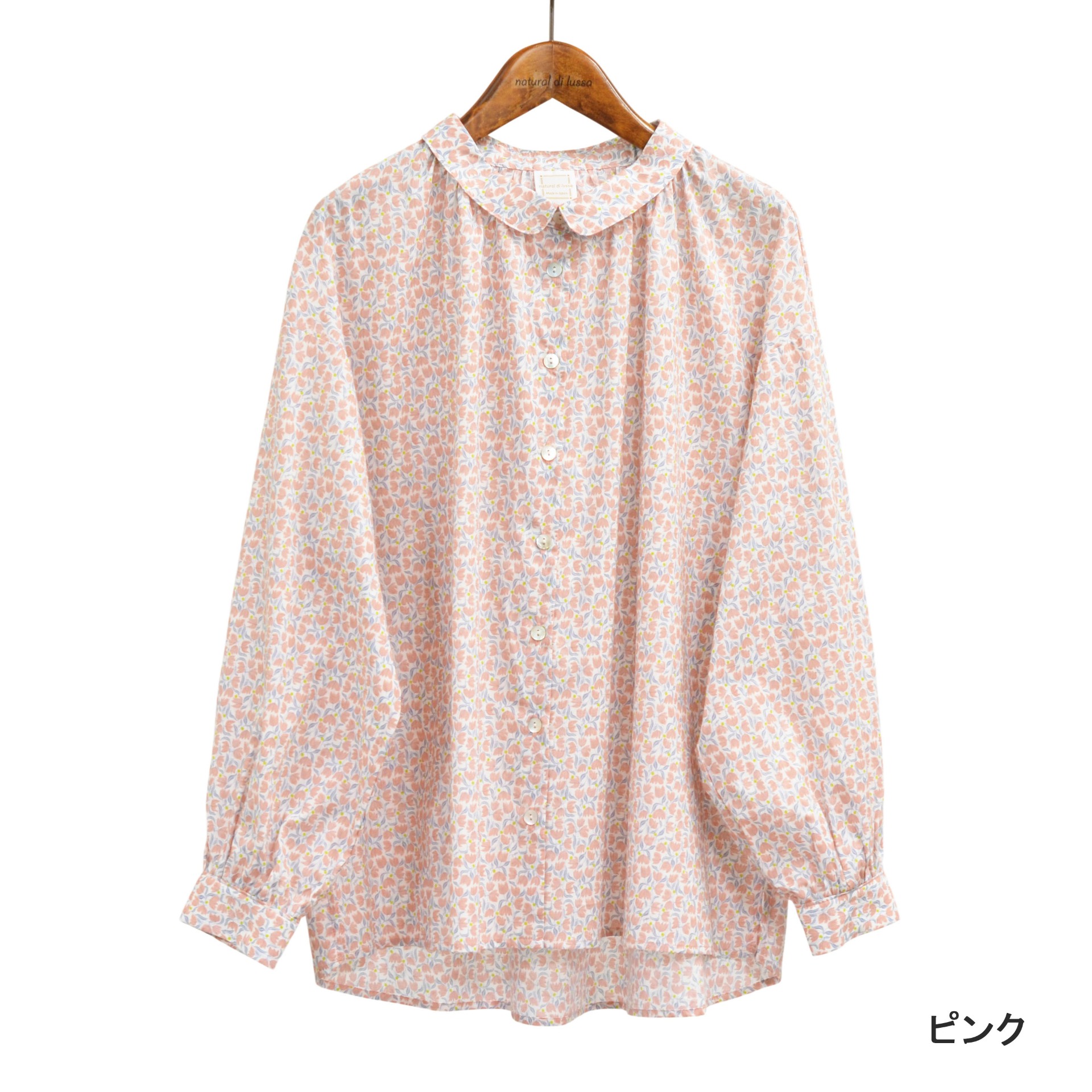 やさしい色合いのチューリップ柄が印象的な、ナチュラルな雰囲気のローンブラウス。