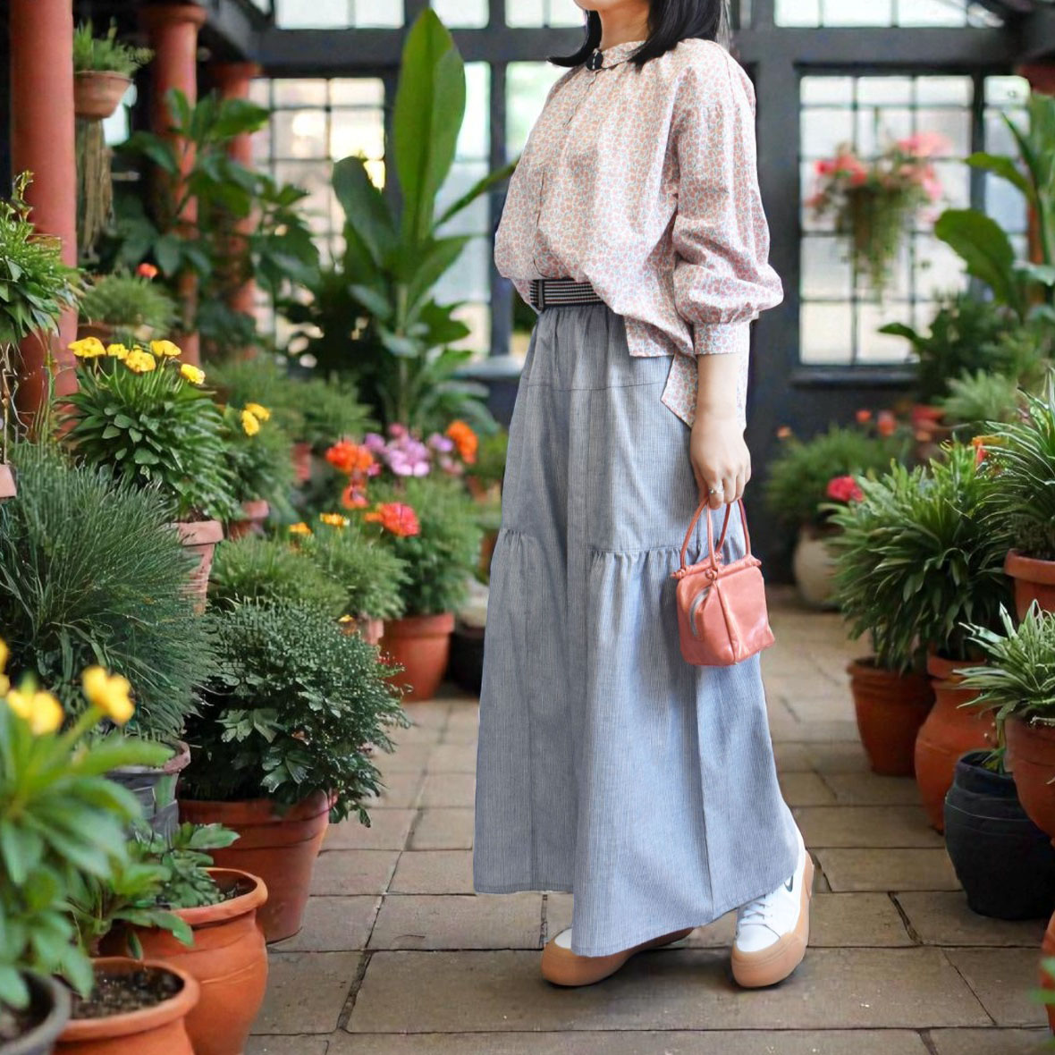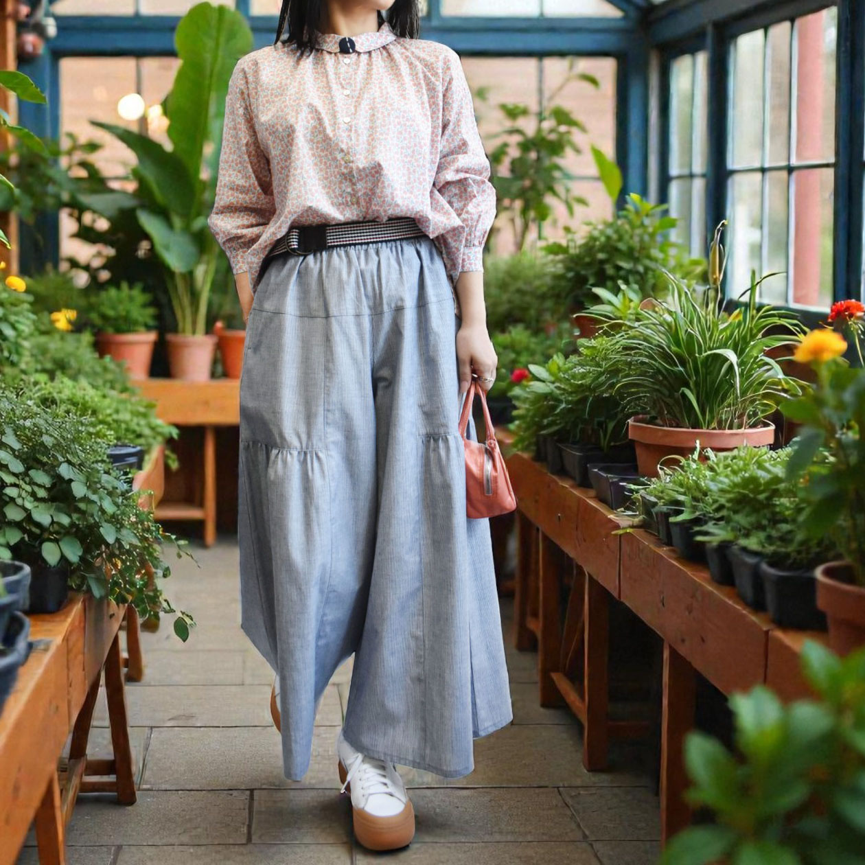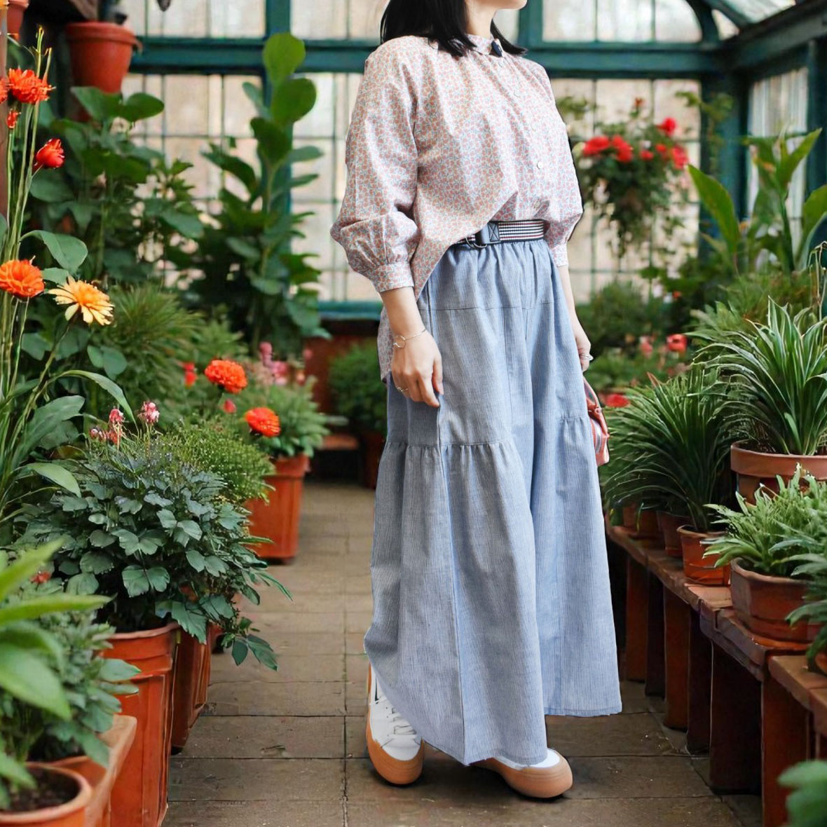 小花のように広がるチューリップ柄がコーディネートにさりげない華やかさを添えてくれます。