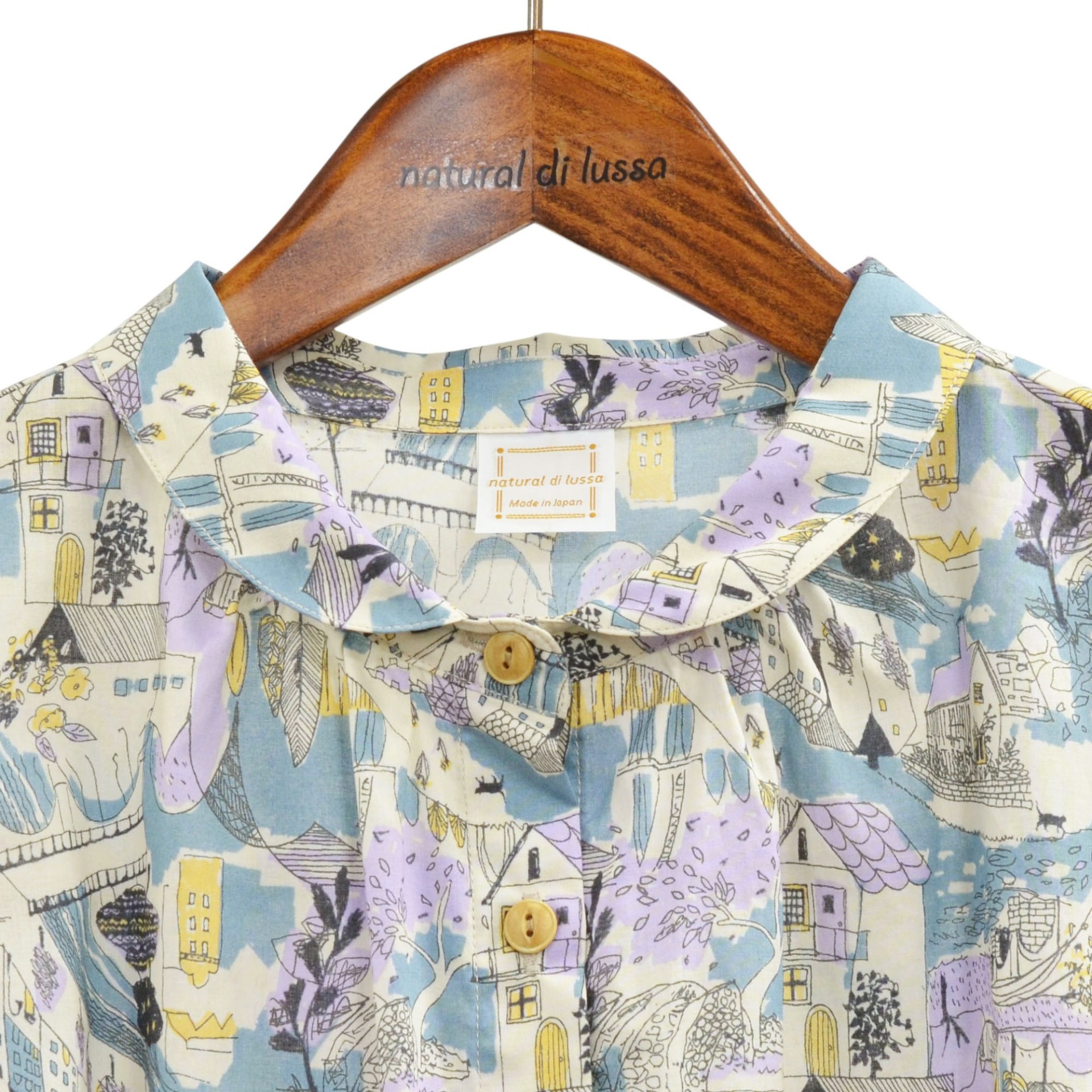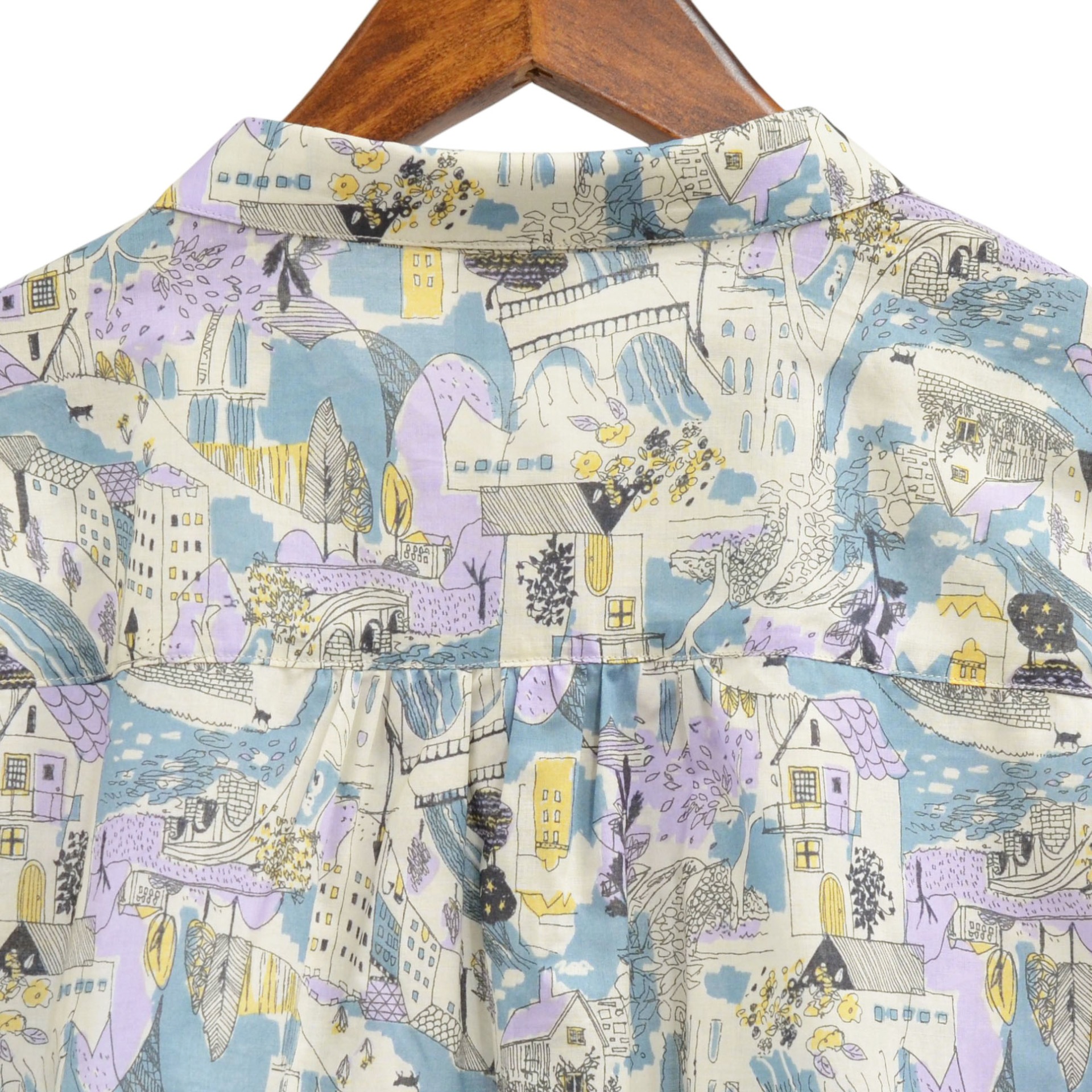 繊細なタッチで描かれた街並み柄をプリントしたブラウス。