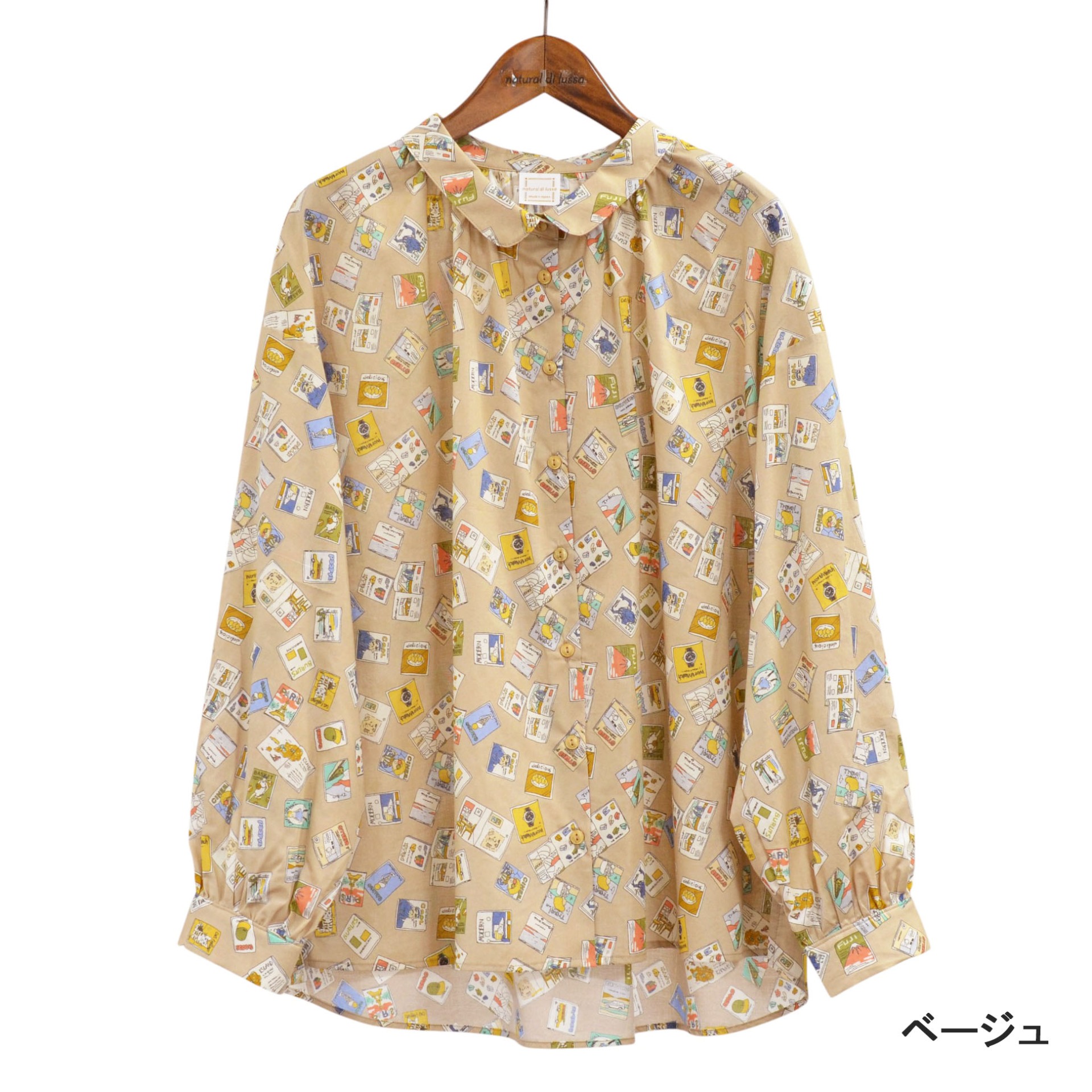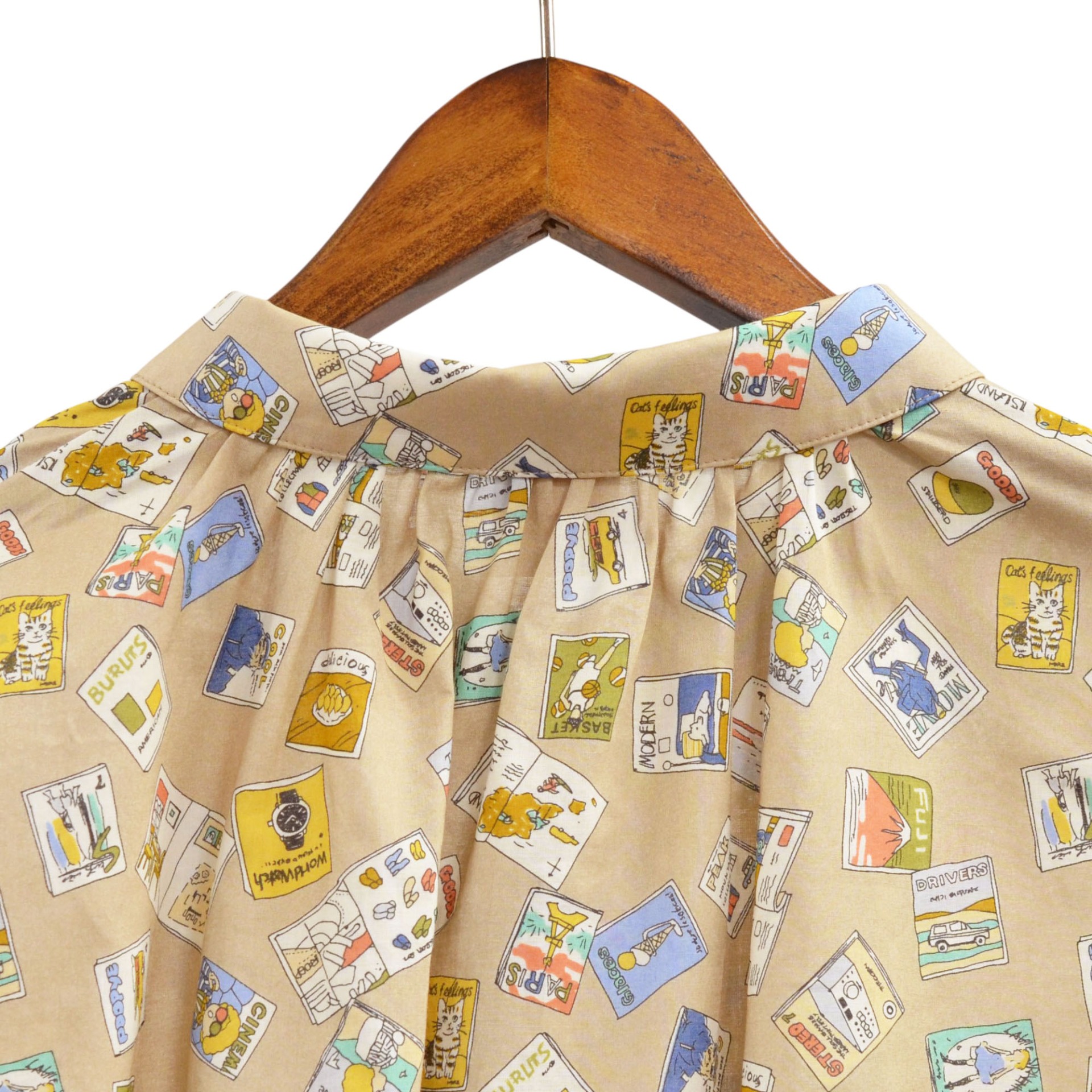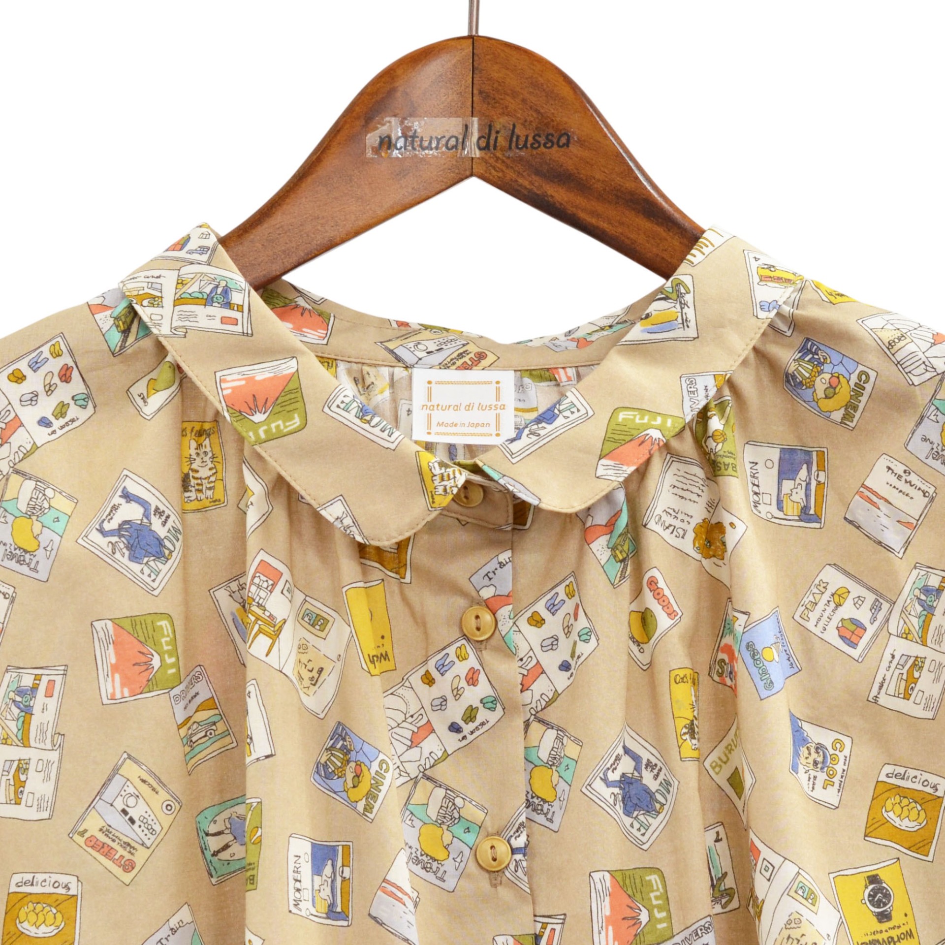 ユニークなレトロプリントが目を惹く、遊び心たっぷりのブラウス。 落ち着いたベージュ地に、雑誌のイラストを散りばめたデザインは、大人のコーディネートにさりげないアクセントをプラスしてくれます。 ゆったりとしたシルエットにふんわり袖で、リラックスした着心地と女性らしい華やかさを両立。