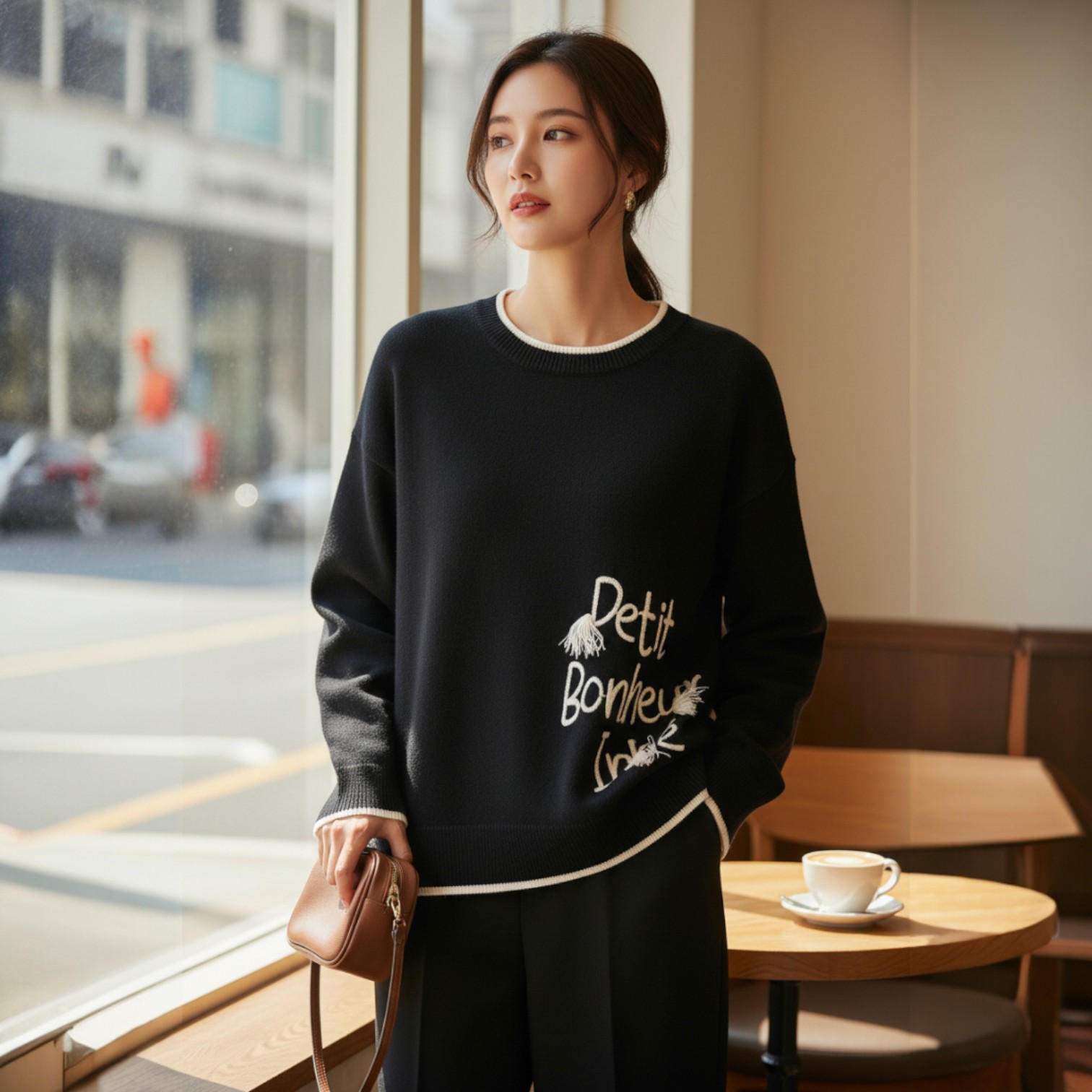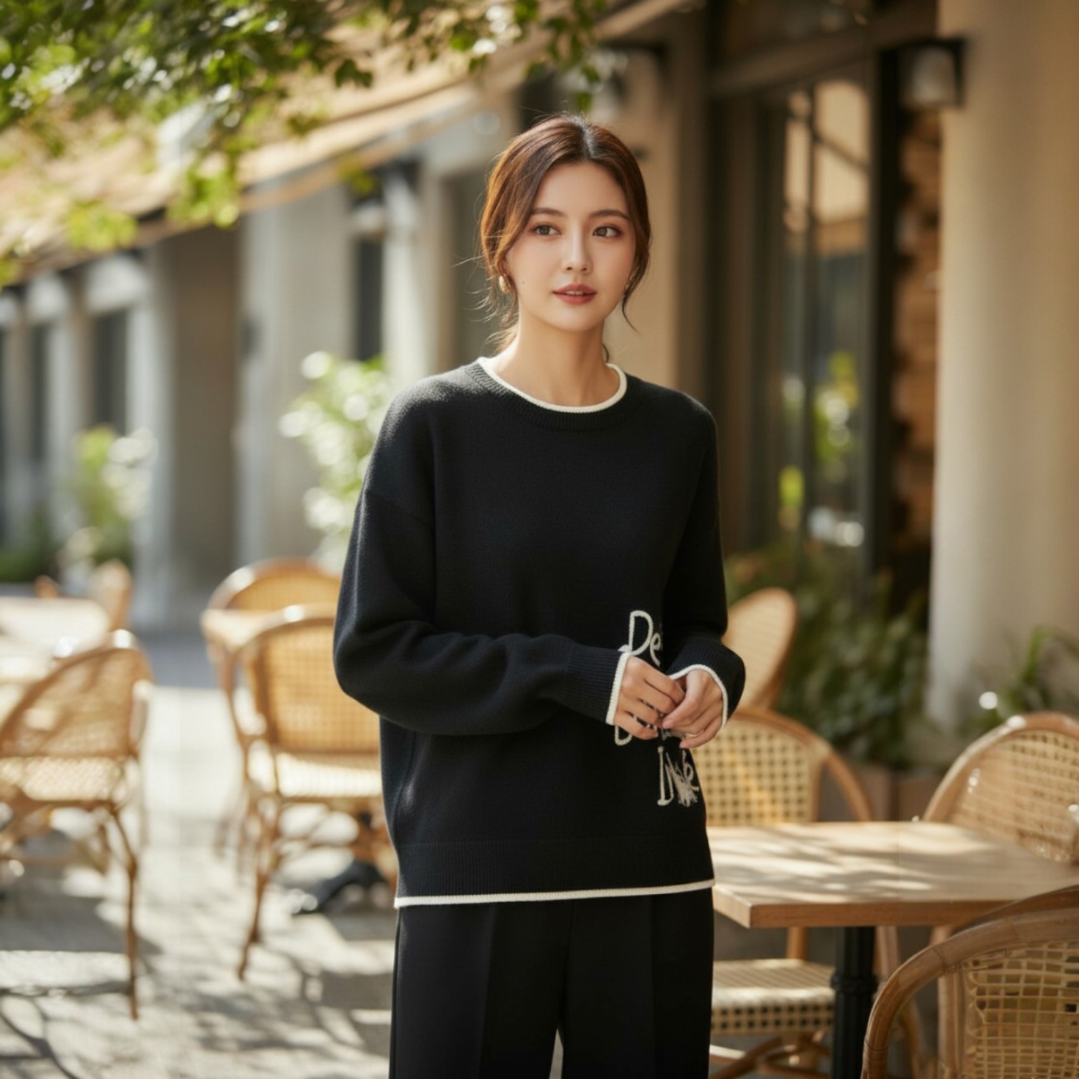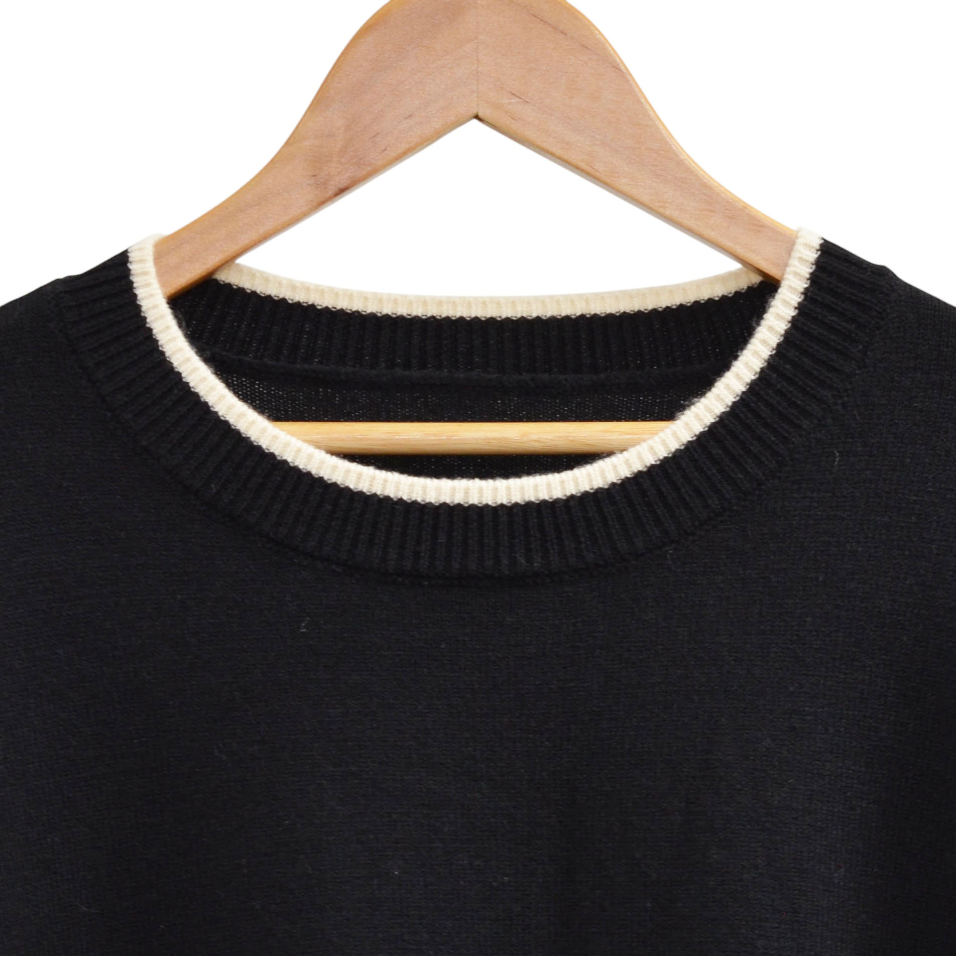 首元、手首、裾の配色がアクセントになっています。