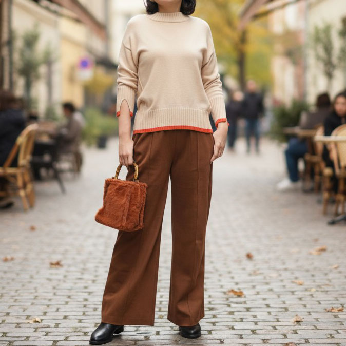 特に裾の配色デザインが、スタイリングのアクセントになり、1枚で着ても印象的に仕上がります。